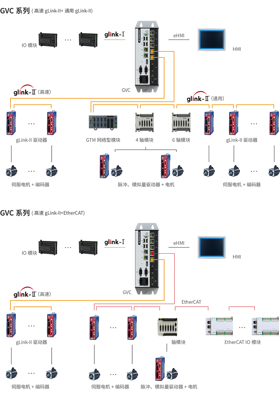 GVC系列運(yùn)動(dòng)控制器支持固高科技高速gLink-II、通用gLink-II或通用EtherCAT現(xiàn)場網(wǎng)絡(luò)通訊協(xié)議,同時(shí)也具有其它接口,例如千兆以太網(wǎng)接口、gLink-I、RS485、RS232、HMI、eHMI等。高速gLink-II可以實(shí)現(xiàn)全數(shù)字、高性能速度和位置閉環(huán)控制,最小伺服閉環(huán)控制周期可達(dá)50微秒,基于內(nèi)置的位置環(huán)、速度環(huán)和前饋等多種濾波算法,GVC系列運(yùn)動(dòng)控制器搭配GSHD高性能伺服驅(qū)動(dòng)器使用,可以實(shí)現(xiàn)對伺服電機(jī)的精準(zhǔn)、高速點(diǎn)位、同步和軌跡插補(bǔ)控制,特別適用于半導(dǎo)體、激光加工、高端數(shù)控機(jī)床等行業(yè);通用gLink-II能夠支持多達(dá)256軸的運(yùn)動(dòng)控制,還支持位置比較輸出(PCO)、位置同步輸出(PSO)、激光能量控制、激光振鏡控制、GNM、GTM多種功能模塊,適用于多種類型的自動(dòng)化設(shè)備和自動(dòng)化流水線的高速、高精度、多通道、多主從、高實(shí)時(shí)的并行控制;通用EtherCAT網(wǎng)絡(luò)可提供達(dá)256軸的通用運(yùn)動(dòng)控制,可配合GSHD-EC高性價(jià)比的伺服驅(qū)動(dòng)器、GNME網(wǎng)絡(luò)型模塊使用,也可支持EtherCAT協(xié)議標(biāo)準(zhǔn)的第三方設(shè)備,適用于多種類型的自動(dòng)化設(shè)備和自動(dòng)化流水線實(shí)時(shí)性要求不高的主從控制。GVC系列運(yùn)動(dòng)控制器還支持gLink-I和eHMI網(wǎng)絡(luò)接口,用于連接多種IO功能模塊和具有eHMI網(wǎng)絡(luò)接口的觸摸屏、按鈕鍵盤等;并具有多個(gè)千兆以太網(wǎng)接口,用于上位機(jī)通訊和連接具有千兆以太網(wǎng)接口的相機(jī),在完成運(yùn)動(dòng)控制的同時(shí),完成機(jī)器視覺處理。