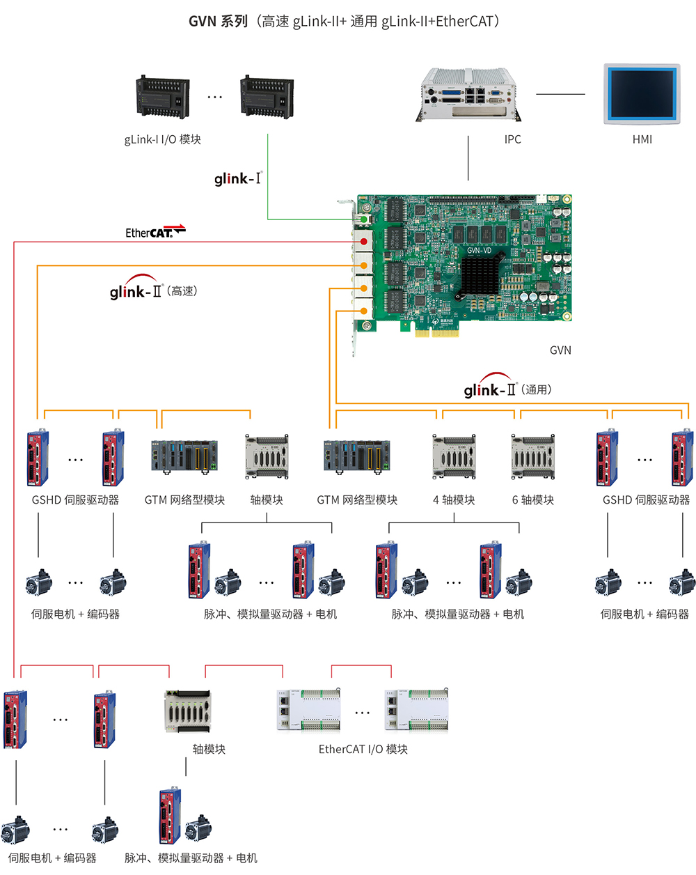 GVN系列插卡式運(yùn)動(dòng)控制器是一款高性能網(wǎng)絡(luò)型運(yùn)動(dòng)控制產(chǎn)品,適用于半導(dǎo)體、激光加工等有高速、高精需求的行業(yè)或有多軸運(yùn)動(dòng)控制需求的自動(dòng)化設(shè)備和自動(dòng)化流水線。產(chǎn)品采用高性能多核處理器,可以實(shí)現(xiàn)高速的運(yùn)動(dòng)控制。GVN支持高速gLink-II、通用gLink-II和EtherCAT三種通訊協(xié)議。高速gLink-II可以實(shí)現(xiàn)8軸高性能閉環(huán)控制,控制周期可達(dá)50微秒,內(nèi)置位置環(huán)、速度環(huán)和各種前饋及濾波算法,搭配GSHD高性能伺服驅(qū)動(dòng)器使用,可對(duì)電機(jī)進(jìn)行精準(zhǔn)高速控制,適用于半導(dǎo)體、激光加工等行業(yè)。通用gLink-II和EtherCAT能夠提供多達(dá)256軸的運(yùn)動(dòng)控制,具有位置比較輸出、PSO、激光能量控制、激光振鏡控制等豐富功能,可搭配GSHD高性能伺服驅(qū)動(dòng)器、GNM軸模塊和GTM模塊使用,同時(shí)兼容標(biāo)準(zhǔn)EtherCAT外設(shè),適用于多種類型的自動(dòng)化設(shè)備和自動(dòng)化流水線。