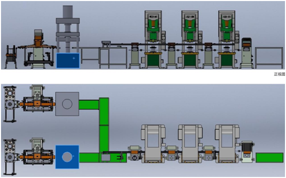 2、 集約化、自動化程度高,與上料機(jī)一起,集上料涂油搬運(yùn)等工序于一體。同時兼顧考慮到拉伸后進(jìn)一步自動化的實(shí)現(xiàn)。(如:二次拉伸、飛邊、轉(zhuǎn)邊、焊鉚、打底等。)