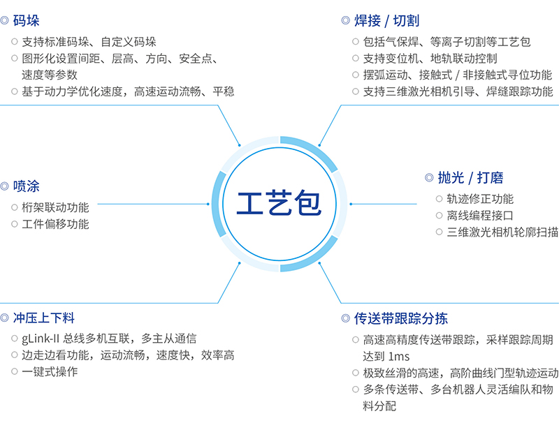 機(jī)器人控制系統(tǒng)開發(fā)平臺(tái)提供弧焊、點(diǎn)焊、切割、噴涂、搬運(yùn)、裝配、加工、碼垛、跟隨取放、數(shù)控雕刻等工藝,廣泛應(yīng)用于汽車、食品、包裝、激光等行業(yè)。