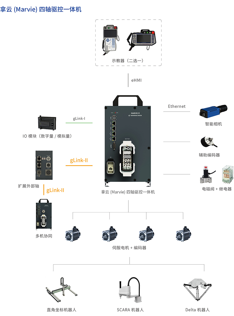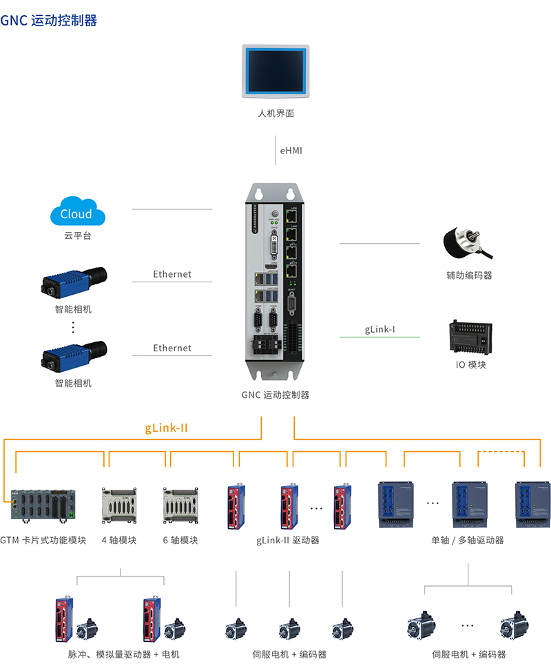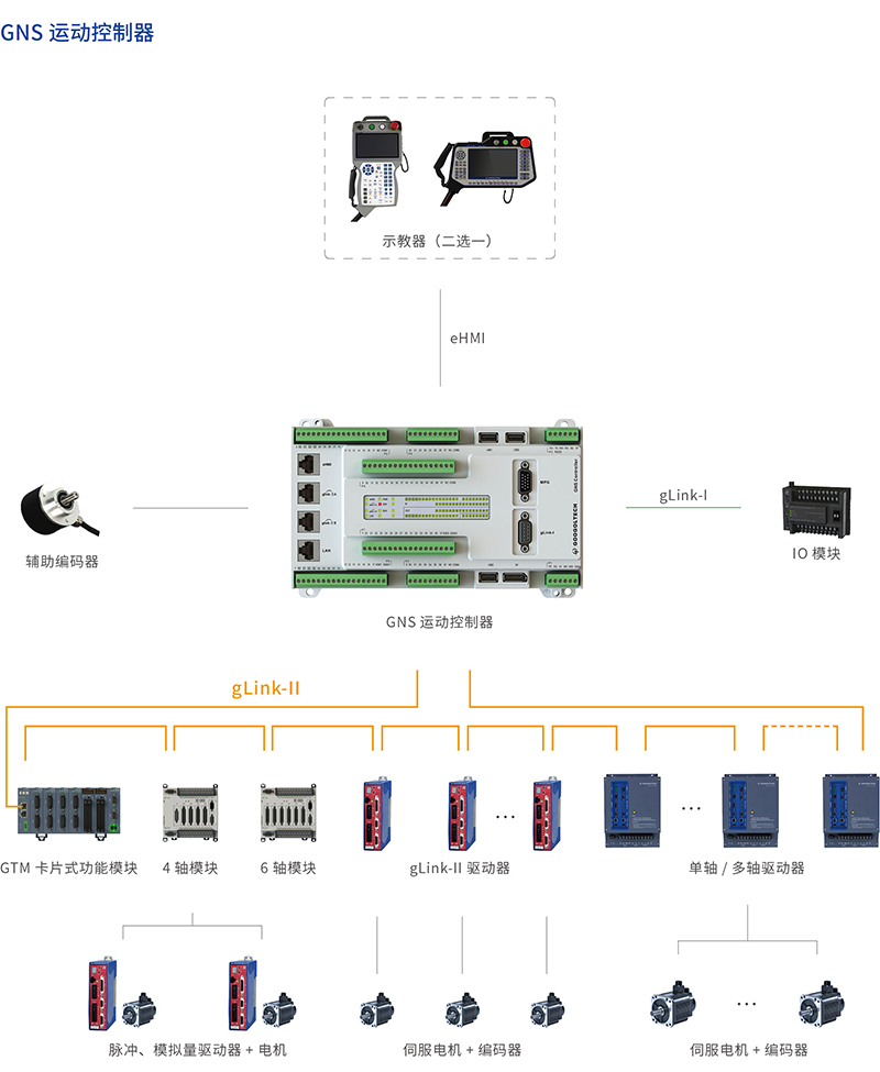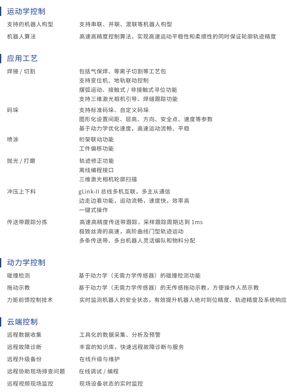 固高科技工業(yè)機(jī)器人控制系統(tǒng)采用高性能運(yùn)動(dòng)控制器實(shí)現(xiàn)機(jī)器人運(yùn)動(dòng)學(xué)、動(dòng)力學(xué)計(jì)算和高速高精度控制,采用自主研發(fā)的 gLink-II 千兆等環(huán)網(wǎng)實(shí)現(xiàn)控制單元間數(shù)據(jù)互聯(lián),具有極高的可靠性、靈活的模塊化擴(kuò)展、便捷的安裝調(diào)試。系統(tǒng)采用分層式、模塊化軟件架構(gòu),具有豐富的軟件功能和行業(yè)工藝包,輕松對(duì)接低代碼產(chǎn)線開發(fā)平臺(tái)、工業(yè)信息化云平臺(tái),支持客戶快速二次開發(fā)和深度定制,打造客戶專屬的機(jī)器人控制系統(tǒng),構(gòu)建全互聯(lián)的智能制造控制系統(tǒng)。