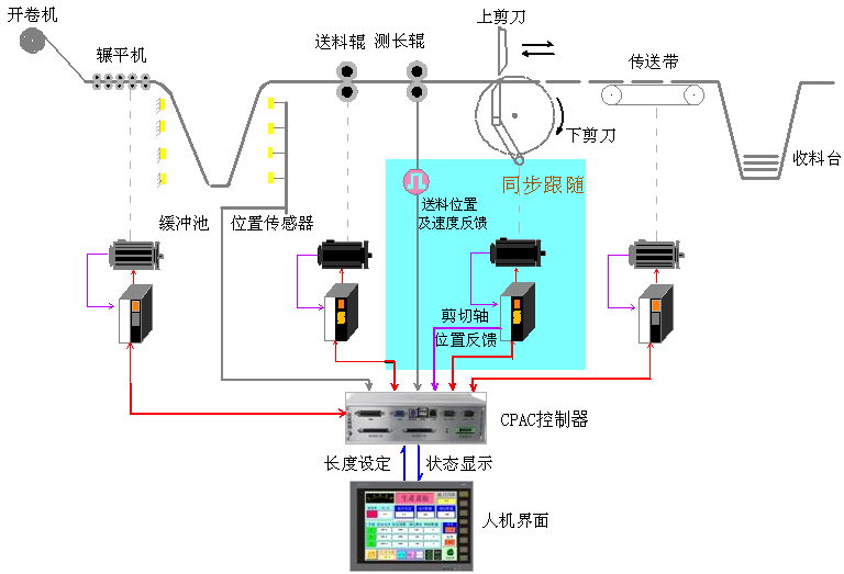 飛剪系統(tǒng)根據(jù)剪切長度和送料速度自動生成驅(qū)動剪切機的數(shù)值指令,當(dāng)“送進長度”接近“ 設(shè)定長度”位置時剪切機加速或減速,在準(zhǔn)確定位于切斷位置的同時剪切機和材料達到速度同步并實施剪斷。此系統(tǒng)可滿足用戶剪切的高精度(誤差小于±1mm)、高速度、寬幅值、高效率、高可靠性等要求,實現(xiàn)了精確定位、快速響應(yīng)的同步速度跟蹤控制算法和伺服電機驅(qū)動算法。