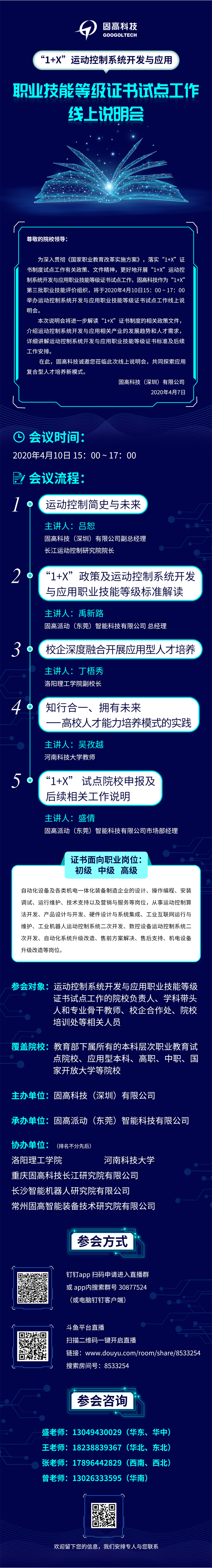 固高科技(深圳)有限公司“1+X”運(yùn)動(dòng)控制系統(tǒng)開發(fā)與應(yīng)用職業(yè)技能等級(jí)證書試點(diǎn)工作線上說明會(huì)將于2020年4月10日15:00~17:00舉辦,誠邀您蒞臨現(xiàn)場(chǎng),共同探索應(yīng)用復(fù)合型人才培養(yǎng)新模式。