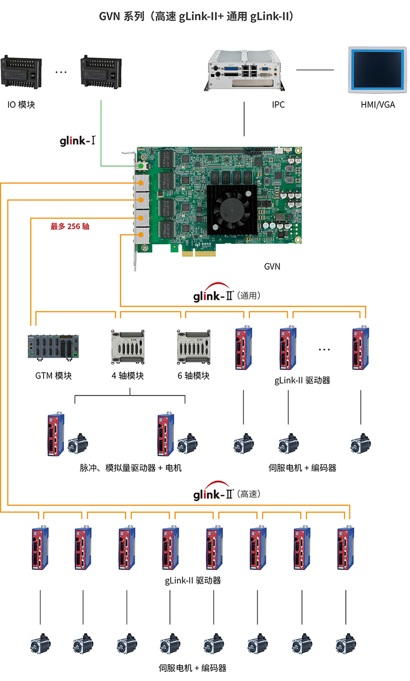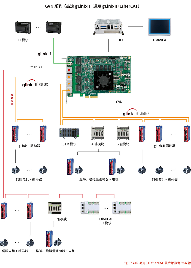GVN 系列插卡式運動控制器采用高性能多核處理器,可以實現(xiàn)高速運動控制,提供高速 gLink-II、通用 gLink-II 和 EtherCAT 三種網(wǎng)絡(luò)接口。