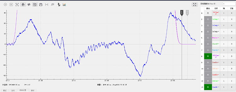 下圖是貼片龍門軸的速度與精度誤差曲線,加速度3G,速度2.5m/s,4ms內(nèi)整定到5um的誤差。龍門同步誤差全段在30um內(nèi)。