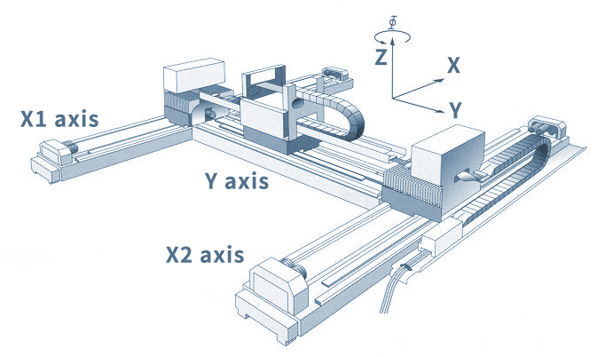 ● 雙軸耦合控制,兩個(gè)軸平均值代表系統(tǒng)質(zhì)心,差值代表龍門偏差;