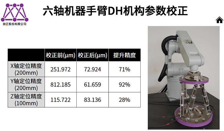 通過(guò)MMD系統(tǒng)的調(diào)試,六軸機(jī)器手臂DH機(jī)構(gòu)參數(shù)校正X軸精度提升71%,Y軸精度提升92%,X軸精度提升28%。