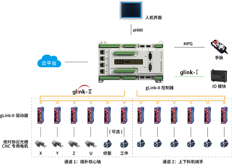 2、基于gLink-II總線GNS高性能控制器最多支持24軸,硬件接口豐富,內(nèi)置UPS掉電保護(hù),多類總線實(shí)現(xiàn)設(shè)備間互聯(lián)互通控制;