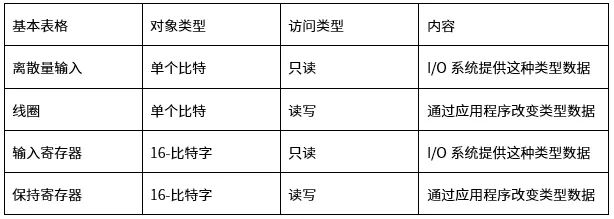 Modbus以一系列具有不同特征表格上的數(shù)據(jù)模型為基礎(chǔ),四個(gè)基本表格如下表所示:
