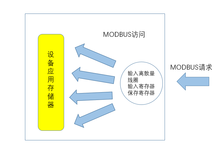 示例描述:一個(gè)設(shè)備中的數(shù)據(jù)結(jié)構(gòu),含有數(shù)字量和模擬量、輸入量和輸出量。由于不同塊中的數(shù)據(jù)不相關(guān),每個(gè)塊是相互獨(dú)立。使用Modbus數(shù)據(jù)模型,按不同 Modbus功能碼訪問每人塊,實(shí)現(xiàn)原理如下所示: